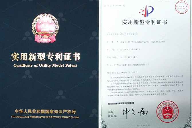 專利證書-超細立式輥磨機