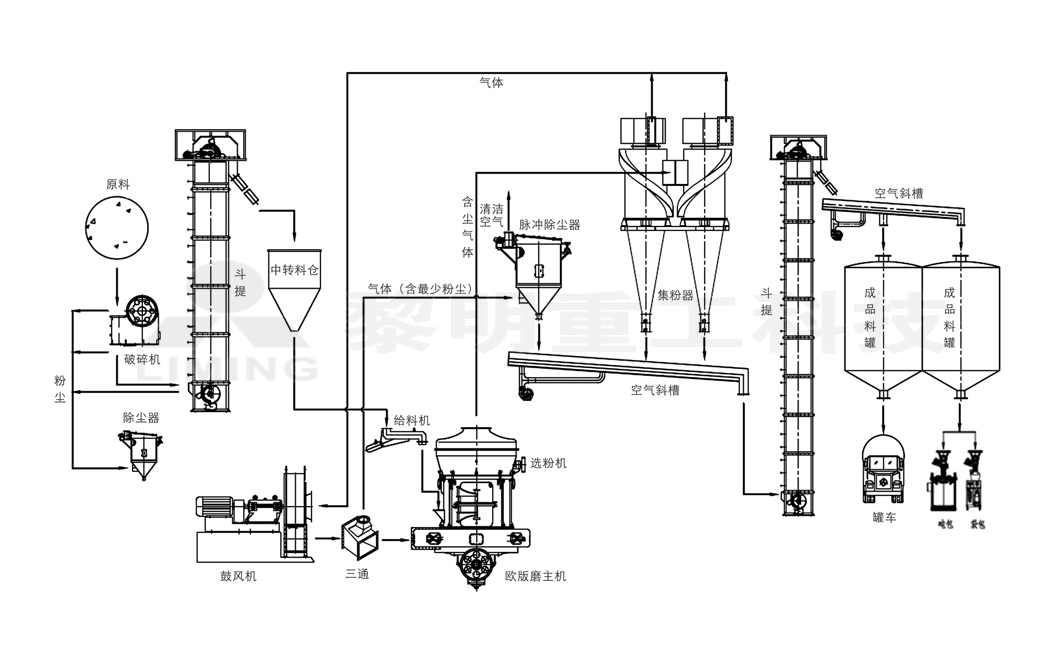 歐版磨粉機(jī)作為一種節(jié)能裝備,其技術(shù)特點(diǎn)是單機(jī)生產(chǎn)能力大、易于規(guī)?;a(chǎn)、單位產(chǎn)品能耗低、易于維護(hù)等,一次成品細(xì)度d97=800~400目(200~38um),單機(jī)生產(chǎn)能力依機(jī)型不同在6~50T/H,其工藝流程圖見(jiàn)圖.