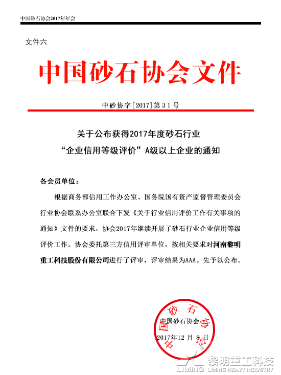 為逐步建立砂石行業(yè)信用體系,提升行業(yè)內(nèi)企業(yè)的信用管理水平,建立健全行業(yè)的工業(yè)化發(fā)展體制,中國砂石協(xié)會特開展砂石行業(yè)企業(yè)信用等級評價工作。2017年,根據(jù)商務(wù)部信用工作辦公室、國務(wù)院國有資產(chǎn)監(jiān)督管理委員會行業(yè)協(xié)會聯(lián)系辦公室聯(lián)合下發(fā)的《關(guān)于行業(yè)信用評價工作有關(guān)事項的通知 》文件要求,在企業(yè)自愿申報的基礎(chǔ)上,中國砂石協(xié)會本著“公開、公正、科學”的原則,嚴格按照信用等級評價程序,聯(lián)同第三方信用評審單位對黎明重工進行了評估,評審結(jié)果為AAA。