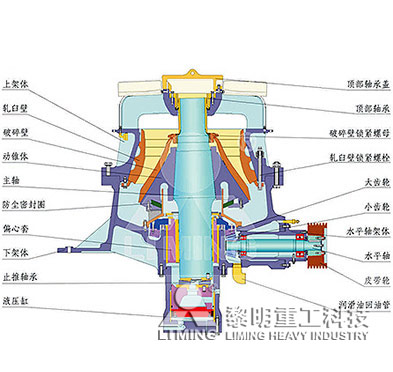 工作時,由電動機帶動水平軸旋轉,水平軸通過齒輪帶動偏心套旋轉,再由偏心套帶動動錐部做圓周擺動,從而實現連續的擠壓破碎石塊。
